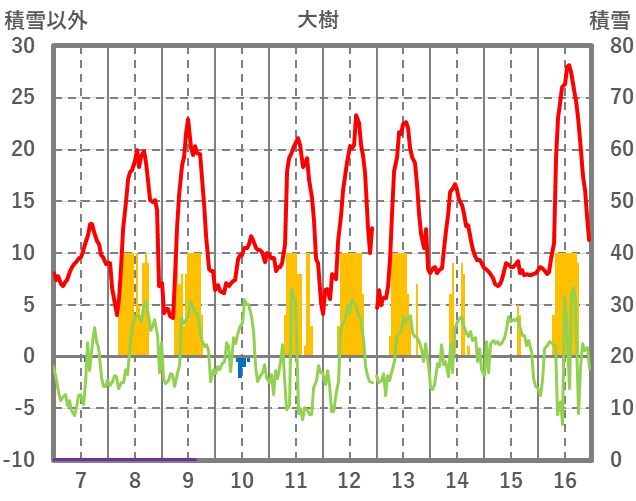 | 日 | 時 | 気温 | 降水 | 風向/風速 | 日照 | 積雪 | 降雪 |