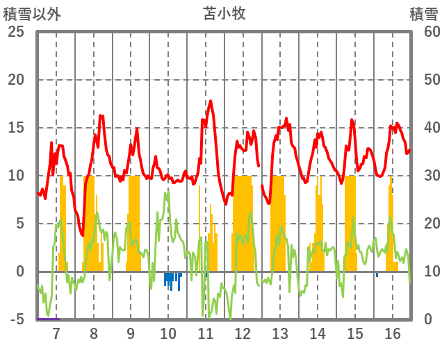 | 日 | 時 | 気温 | 降水 | 風向/風速 | 日照 | 積雪 | 降雪 |