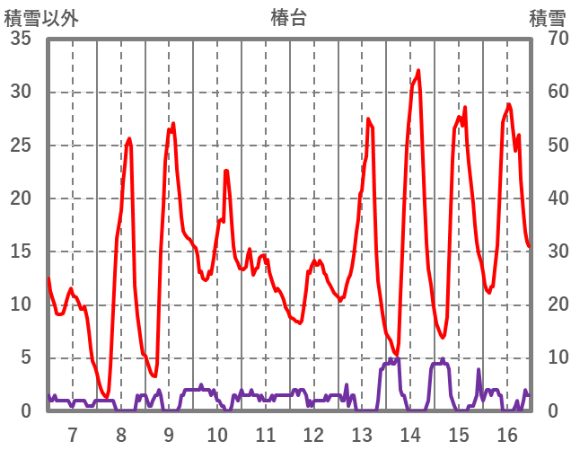| 日 | 時 | 気温 | 降水 | 風向/風速 | 日照 | 積雪 | 降雪 |