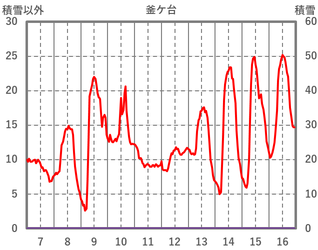 | 日 | 時 | 気温 | 降水 | 風向/風速 | 日照 | 積雪 | 降雪 |