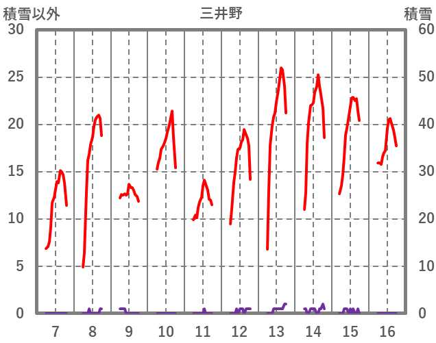 | 日 | 時 | 気温 | 降水 | 風向/風速 | 日照 | 積雪 | 降雪 |