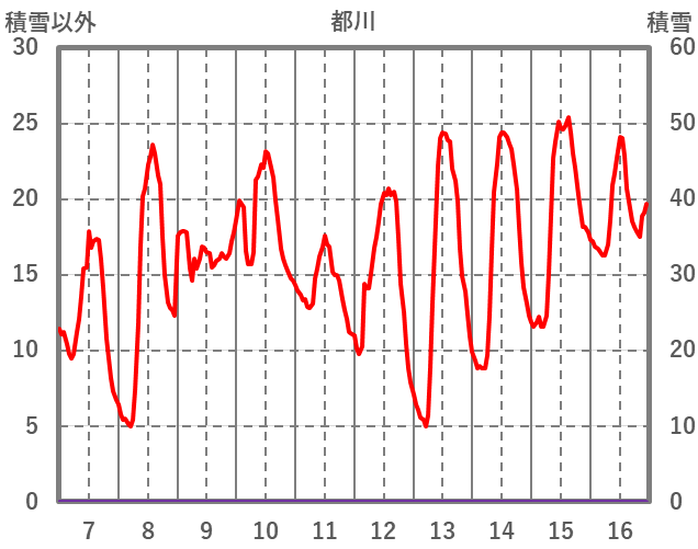 | 日 | 時 | 気温 | 降水 | 風向/風速 | 日照 | 積雪 | 降雪 |