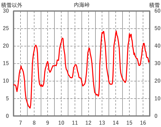 | 日 | 時 | 気温 | 降水 | 風向/風速 | 日照 | 積雪 | 降雪 |