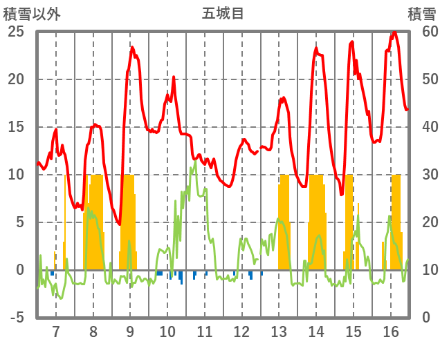 | 日 | 時 | 気温 | 降水 | 風向/風速 | 日照 | 積雪 | 降雪 |