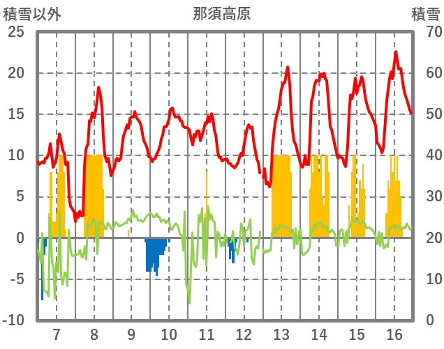 | 日 | 時 | 気温 | 降水 | 風向/風速 | 日照 | 積雪 | 降雪 |
