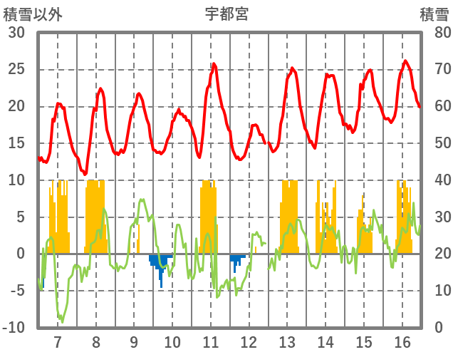 | 日 | 時 | 気温 | 降水 | 風向/風速 | 日照 | 積雪 | 降雪 |