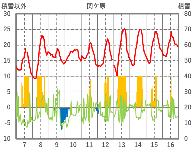 | 日 | 時 | 気温 | 降水 | 風向/風速 | 日照 | 積雪 | 降雪 |