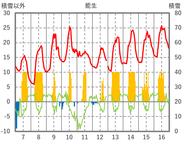 | 日 | 時 | 気温 | 降水 | 風向/風速 | 日照 | 積雪 | 降雪 |