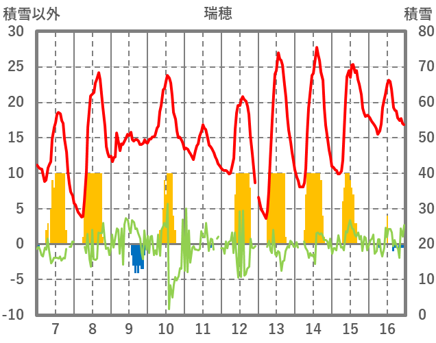 | 日 | 時 | 気温 | 降水 | 風向/風速 | 日照 | 積雪 | 降雪 |