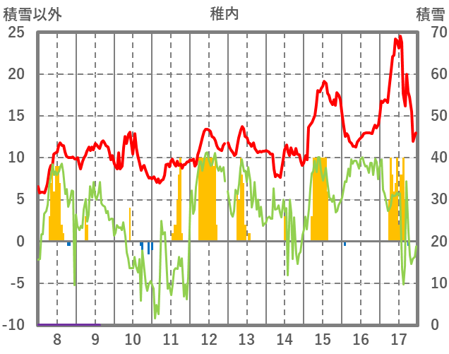 | 日 | 時 | 気温 | 降水 | 風向/風速 | 日照 | 積雪 | 降雪 |