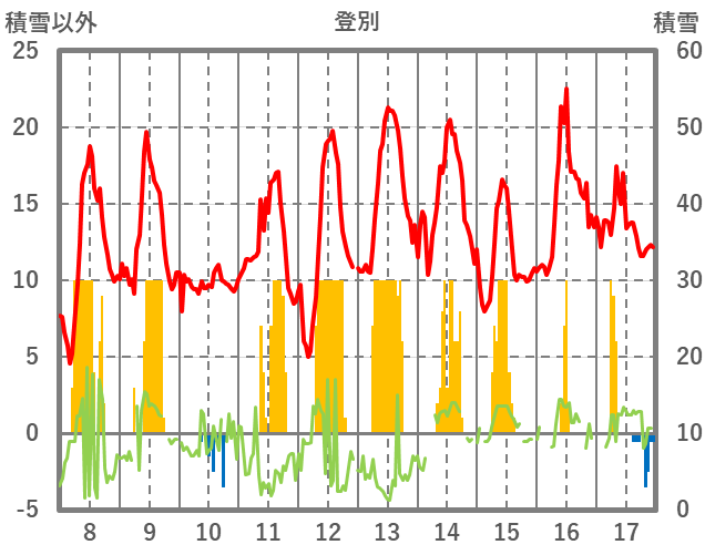 | 日 | 時 | 気温 | 降水 | 風向/風速 | 日照 | 積雪 | 降雪 |