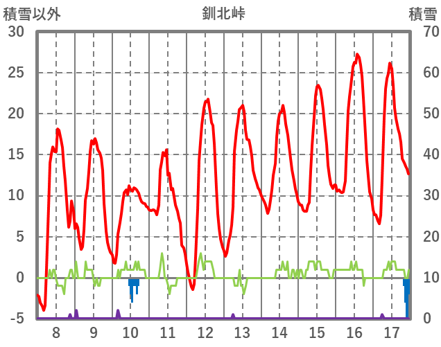| 日 | 時 | 気温 | 降水 | 風向/風速 | 日照 | 積雪 | 降雪 |