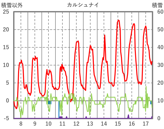 | 日 | 時 | 気温 | 降水 | 風向/風速 | 日照 | 積雪 | 降雪 |
