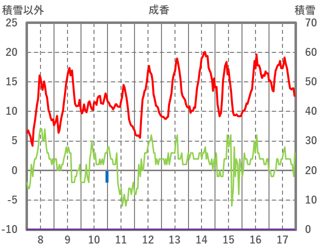 | 日 | 時 | 気温 | 降水 | 風向/風速 | 日照 | 積雪 | 降雪 |