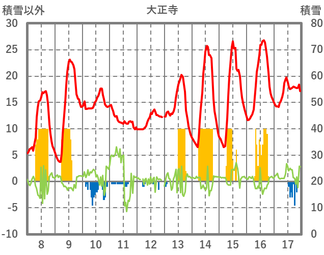 | 日 | 時 | 気温 | 降水 | 風向/風速 | 日照 | 積雪 | 降雪 |
