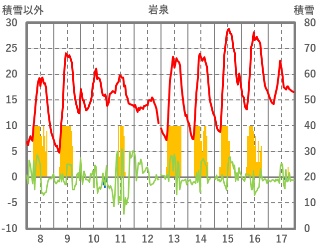 | 日 | 時 | 気温 | 降水 | 風向/風速 | 日照 | 積雪 | 降雪 |