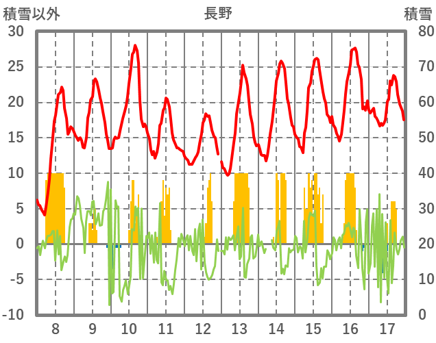 | 日 | 時 | 気温 | 降水 | 風向/風速 | 日照 | 積雪 | 降雪 |