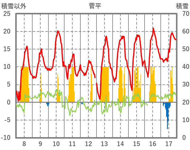 | 日 | 時 | 気温 | 降水 | 風向/風速 | 日照 | 積雪 | 降雪 |