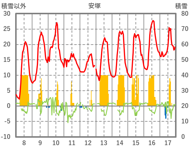 | 日 | 時 | 気温 | 降水 | 風向/風速 | 日照 | 積雪 | 降雪 |