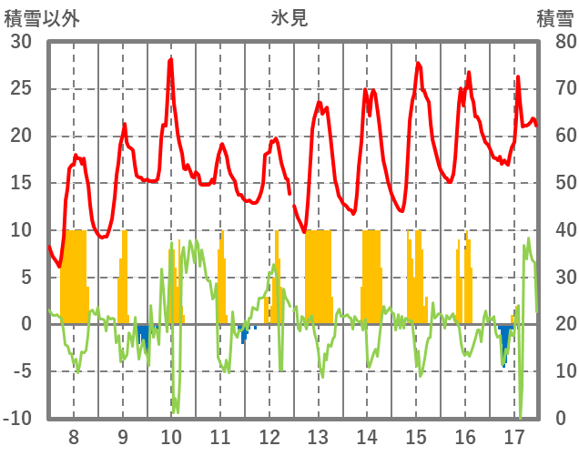 | 日 | 時 | 気温 | 降水 | 風向/風速 | 日照 | 積雪 | 降雪 |