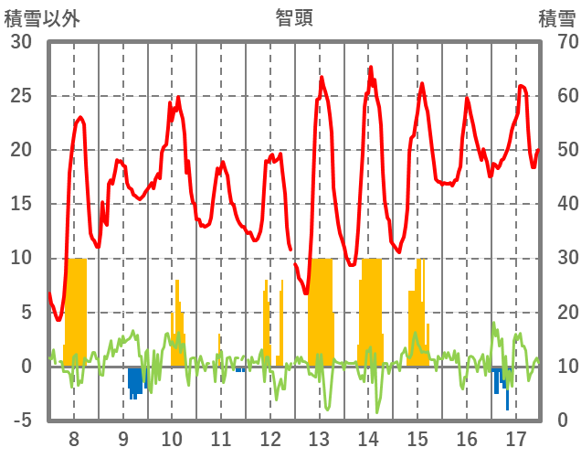 | 日 | 時 | 気温 | 降水 | 風向/風速 | 日照 | 積雪 | 降雪 |