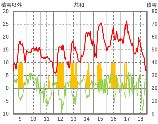 | 日 | 時 | 気温 | 降水 | 風向/風速 | 日照 | 積雪 | 降雪 |