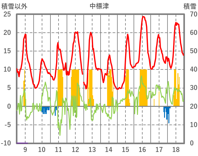| 日 | 時 | 気温 | 降水 | 風向/風速 | 日照 | 積雪 | 降雪 |
