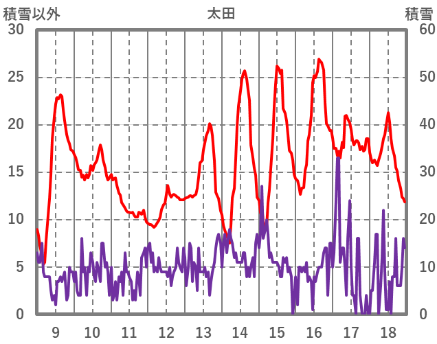 | 日 | 時 | 気温 | 降水 | 風向/風速 | 日照 | 積雪 | 降雪 |