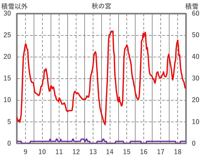| 日 | 時 | 気温 | 降水 | 風向/風速 | 日照 | 積雪 | 降雪 |