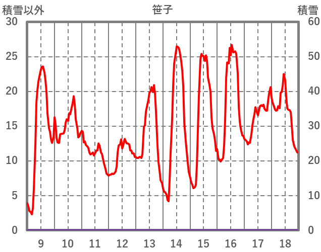 | 日 | 時 | 気温 | 降水 | 風向/風速 | 日照 | 積雪 | 降雪 |