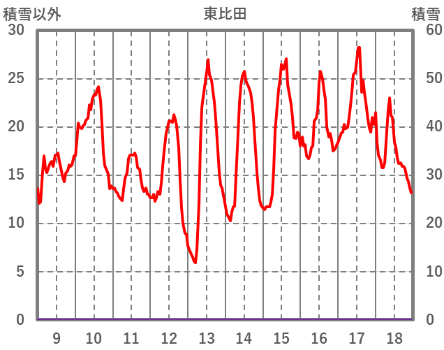 | 日 | 時 | 気温 | 降水 | 風向/風速 | 日照 | 積雪 | 降雪 |