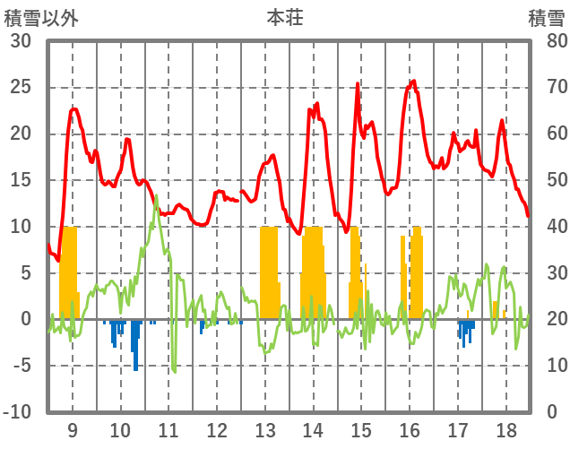 | 日 | 時 | 気温 | 降水 | 風向/風速 | 日照 | 積雪 | 降雪 |
