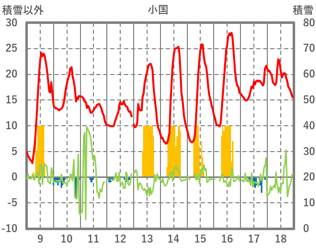 | 日 | 時 | 気温 | 降水 | 風向/風速 | 日照 | 積雪 | 降雪 |