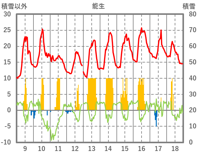 | 日 | 時 | 気温 | 降水 | 風向/風速 | 日照 | 積雪 | 降雪 |