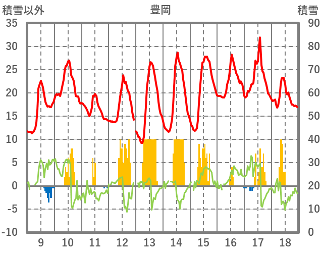| 日 | 時 | 気温 | 降水 | 風向/風速 | 日照 | 積雪 | 降雪 |