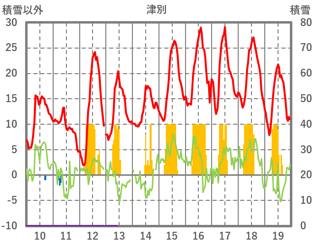 | 日 | 時 | 気温 | 降水 | 風向/風速 | 日照 | 積雪 | 降雪 |