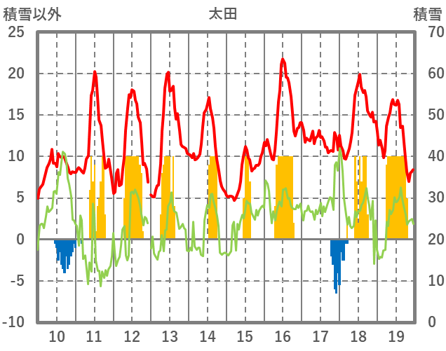 | 日 | 時 | 気温 | 降水 | 風向/風速 | 日照 | 積雪 | 降雪 |