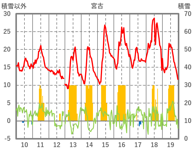 | 日 | 時 | 気温 | 降水 | 風向/風速 | 日照 | 積雪 | 降雪 |