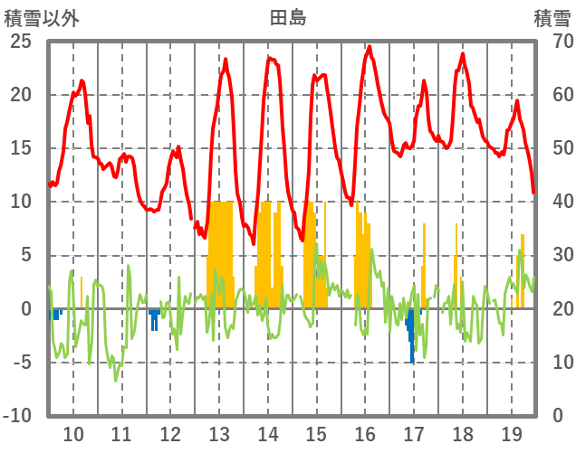 | 日 | 時 | 気温 | 降水 | 風向/風速 | 日照 | 積雪 | 降雪 |