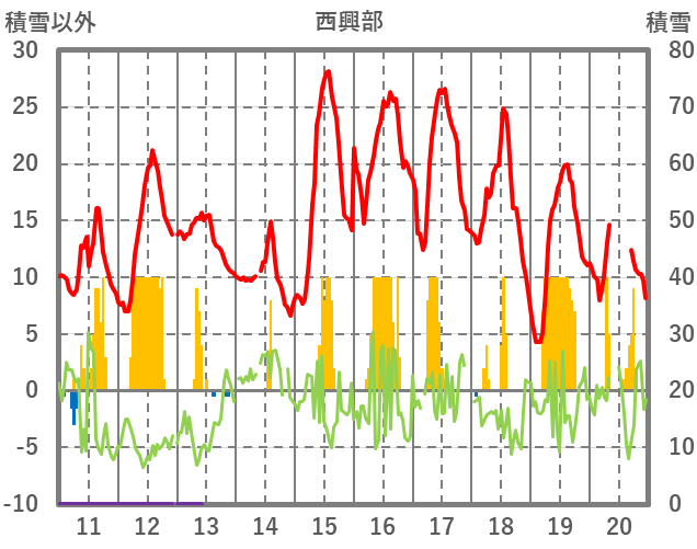 | 日 | 時 | 気温 | 降水 | 風向/風速 | 日照 | 積雪 | 降雪 |