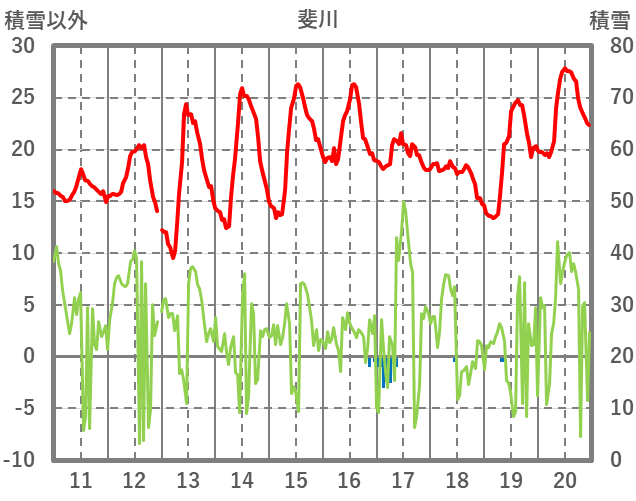 | 日 | 時 | 気温 | 降水 | 風向/風速 | 日照 | 積雪 | 降雪 |
