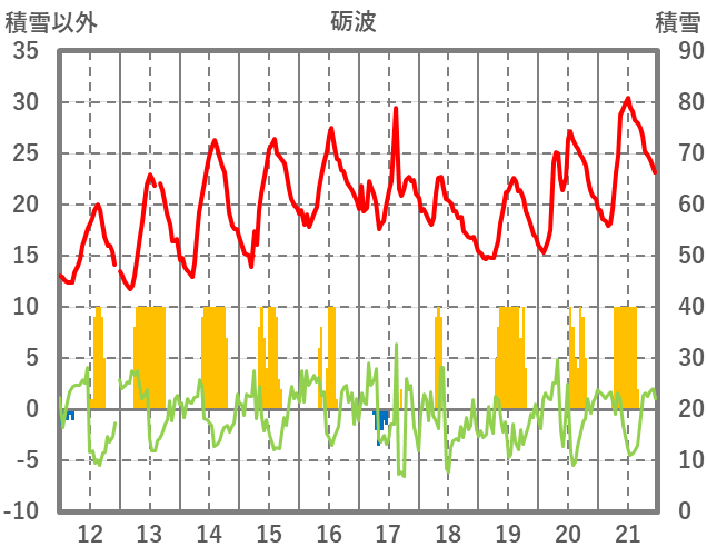 | 日 | 時 | 気温 | 降水 | 風向/風速 | 日照 | 積雪 | 降雪 |