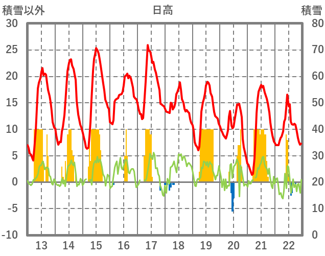 | 日 | 時 | 気温 | 降水 | 風向/風速 | 日照 | 積雪 | 降雪 |