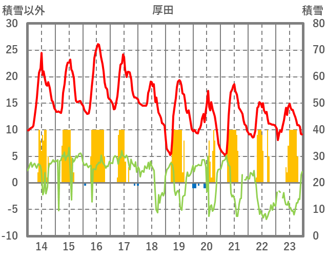 | 日 | 時 | 気温 | 降水 | 風向/風速 | 日照 | 積雪 | 降雪 |