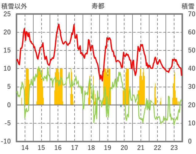 | 日 | 時 | 気温 | 降水 | 風向/風速 | 日照 | 積雪 | 降雪 |