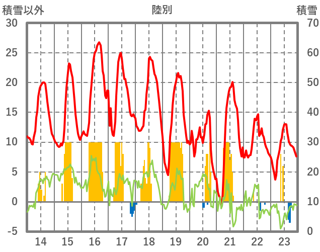 | 日 | 時 | 気温 | 降水 | 風向/風速 | 日照 | 積雪 | 降雪 |