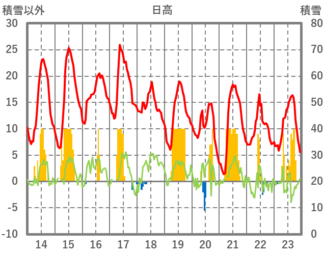 | 日 | 時 | 気温 | 降水 | 風向/風速 | 日照 | 積雪 | 降雪 |