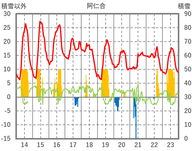 | 日 | 時 | 気温 | 降水 | 風向/風速 | 日照 | 積雪 | 降雪 |
