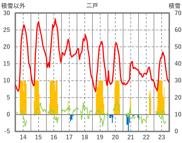 | 日 | 時 | 気温 | 降水 | 風向/風速 | 日照 | 積雪 | 降雪 |