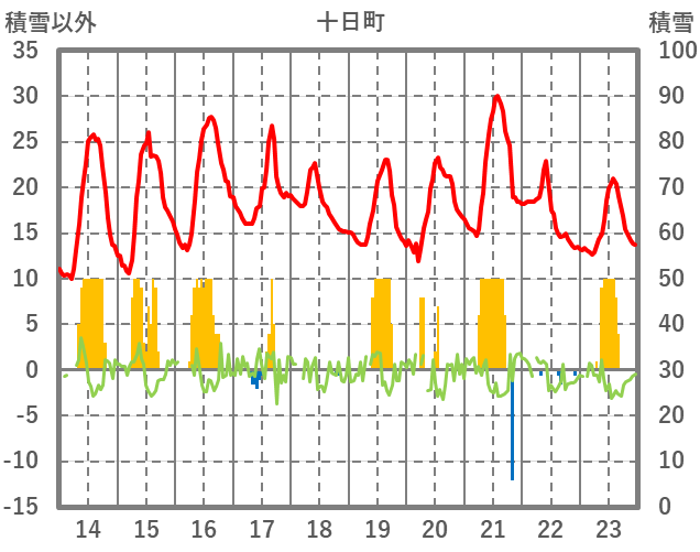 | 日 | 時 | 気温 | 降水 | 風向/風速 | 日照 | 積雪 | 降雪 |
